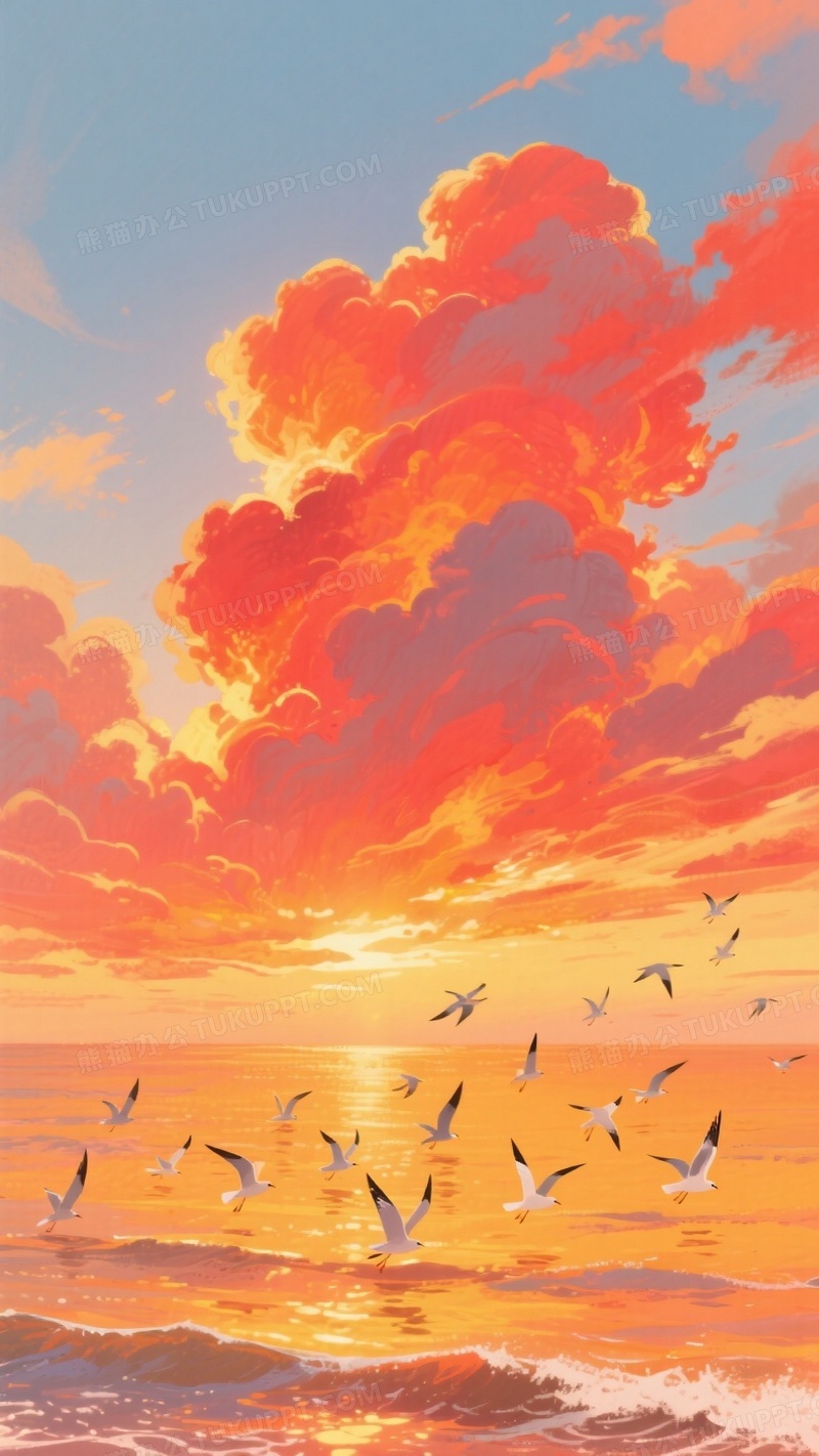本作品内容为治愈感插画天空中橙红色的火烧云绚烂夺目, 格式为 jpg, 大小1 MB, 图片尺寸为936 x 1664, 源文件无水印, 欢迎使用熊猫办公。 如认为平台内容涉嫌侵权,可通过邮件:tousu@tukuppt.com提出书面通知,我们将及时处理。