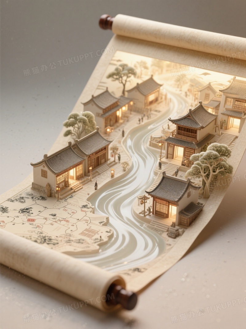 本作品内容为一副打开的卷轴里面的微景观, 格式为 jpg, 大小1 MB, 图片尺寸为1104 x 1472, 源文件无水印, 欢迎使用熊猫办公。 如认为平台内容涉嫌侵权,可通过邮件:tousu@tukuppt.com提出书面通知,我们将及时处理。