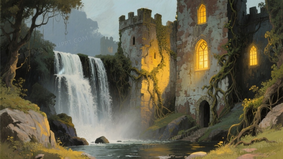 本作品内容为复古风格瀑布插画瀑布位于古老城堡旁, 格式为 jpg, 大小1 MB, 图片尺寸为1664 x 936, 源文件无水印, 欢迎使用熊猫办公。 如认为平台内容涉嫌侵权,可通过邮件:tousu@tukuppt.com提出书面通知,我们将及时处理。