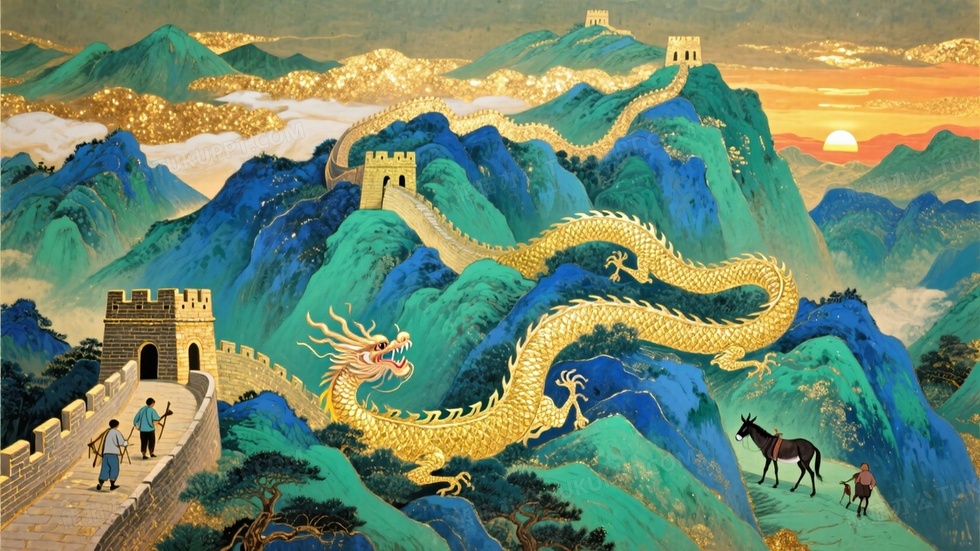 首页 > 插画 > 科技艺术 > 其他 > 青绿山水风格长城图石青石绿泼彩表现崇山峻岭
