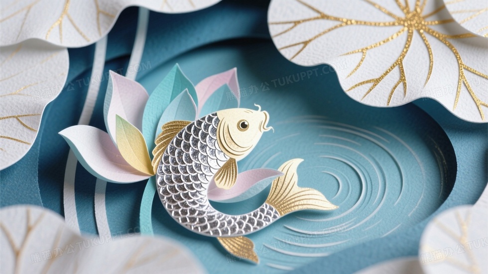 本作品内容为纸雕立体风格荷花鲤鱼图, 格式为 jpg, 大小1 MB, 图片尺寸为1664 x 936, 源文件无水印, 欢迎使用熊猫办公。 如认为平台内容涉嫌侵权,可通过邮件:tousu@tukuppt.com提出书面通知,我们将及时处理。