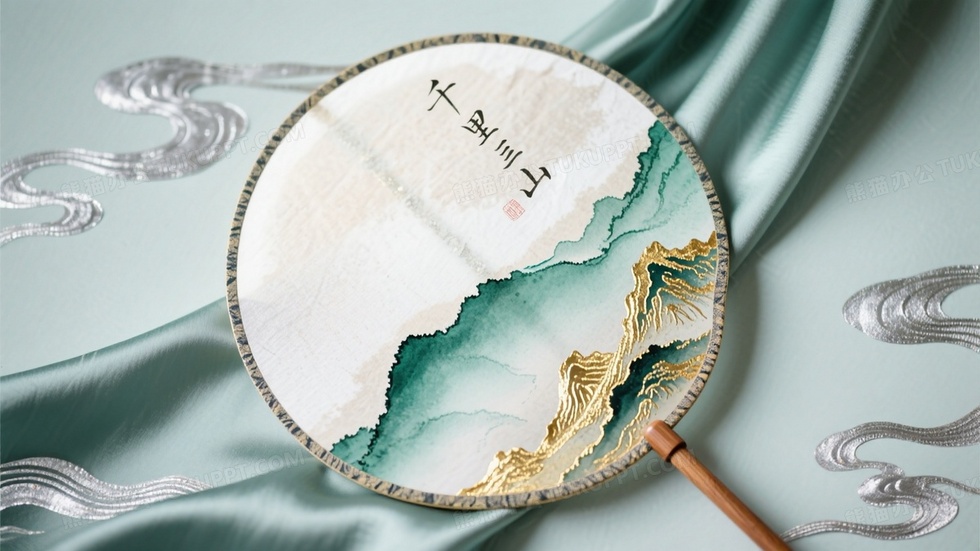 本作品内容为淡雅水墨团扇背景图檀木扇骨透出金色山脉纹理, 格式为 jpg, 大小1 MB, 图片尺寸为1664 x 936, 作品中背景图片无需修改, 源文件无水印,可以直接使用, 欢迎使用熊猫办公。 如认为平台内容涉嫌侵权,可通过邮件:tousu@tukuppt.com提出书面通知,我们将及时处理。