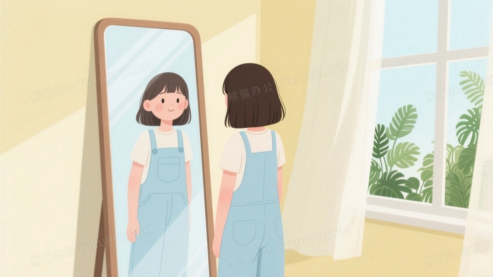 本作品内容为清新风格卡通插画女孩穿着淡蓝色背带裤套装对着全身镜, 格式为 jpg, 大小1 MB, 图片尺寸为1664 x 936, 源文件无水印, 欢迎使用熊猫办公。 如认为平台内容涉嫌侵权,可通过邮件:tousu@tukuppt.com提出书面通知,我们将及时处理。