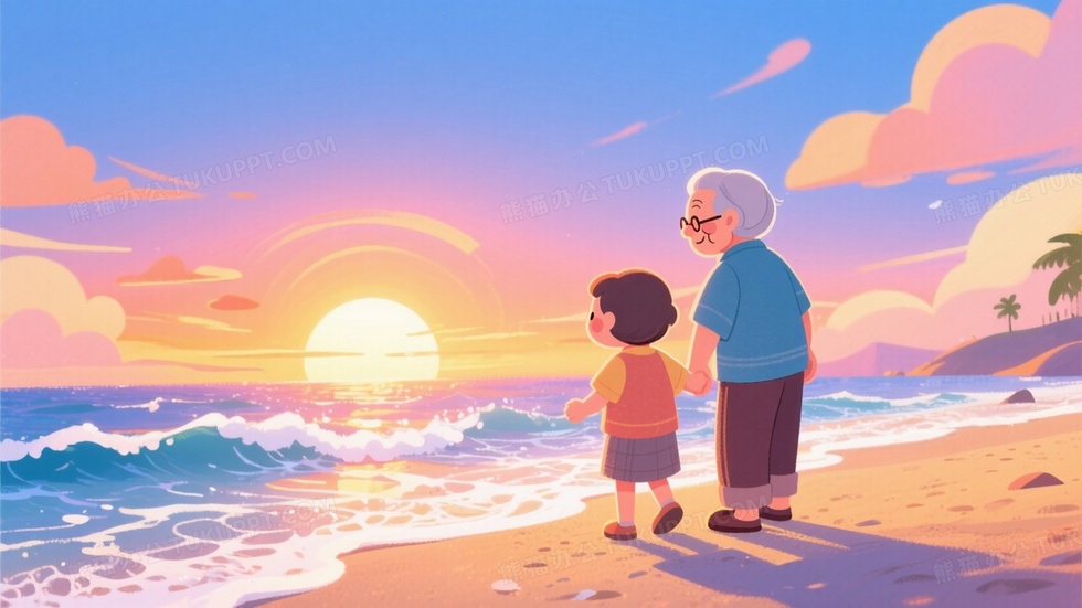 本作品内容为高清公益卡通插画祖孙携手在海边看日落, 格式为 jpg, 大小1 MB, 图片尺寸为1664 x 936, 源文件无水印, 欢迎使用熊猫办公。 如认为平台内容涉嫌侵权,可通过邮件:tousu@tukuppt.com提出书面通知,我们将及时处理。