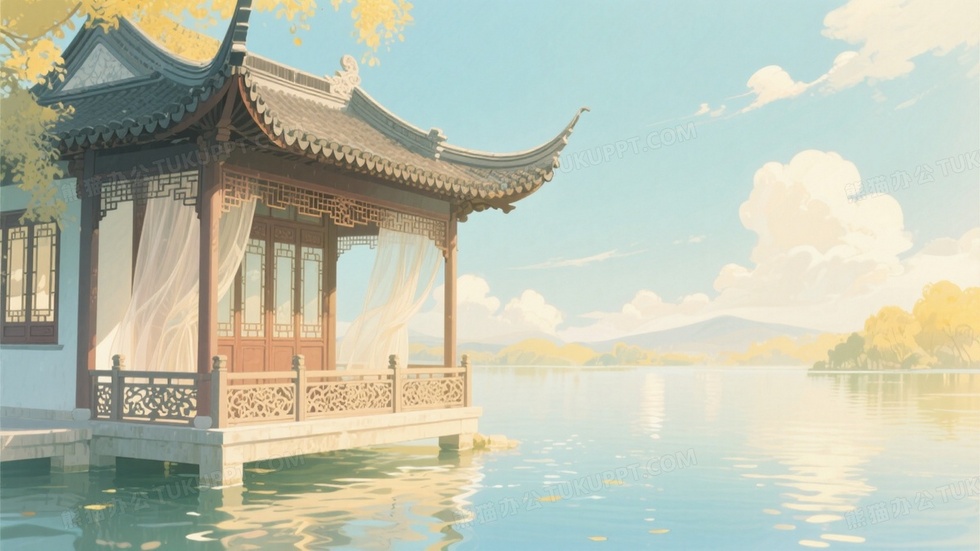 本作品内容为中式审美古风插画亭台楼阁建在湖边, 格式为 jpg, 大小1 MB, 图片尺寸为1664 x 936, 源文件无水印, 欢迎使用熊猫办公。 如认为平台内容涉嫌侵权,可通过邮件:tousu@tukuppt.com提出书面通知,我们将及时处理。