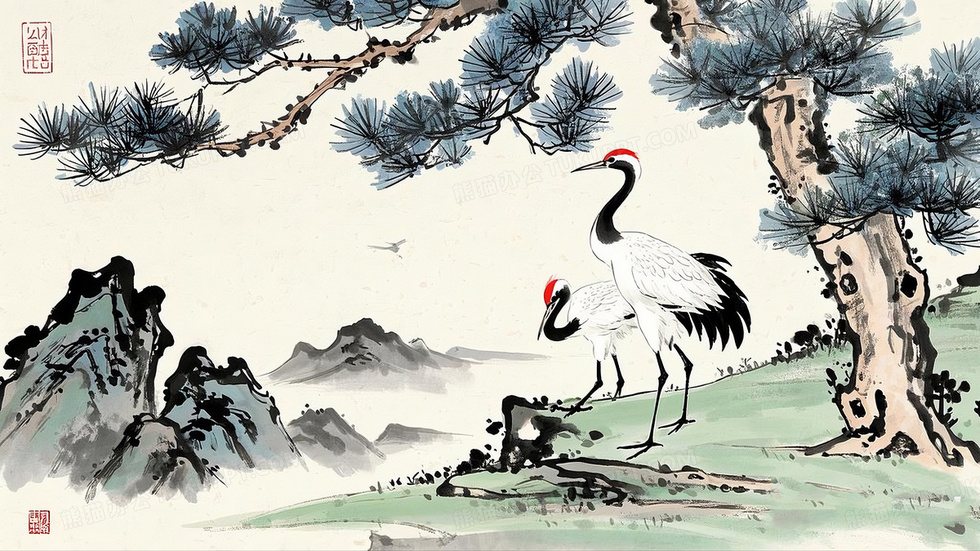 本作品内容为中国水墨风松鹤场景插画, 格式为 jpg, 大小3 MB, 图片尺寸为2720 x 1530, 源文件无水印, 欢迎使用熊猫办公。 如认为平台内容涉嫌侵权,可通过邮件:tousu@tukuppt.com提出书面通知,我们将及时处理。