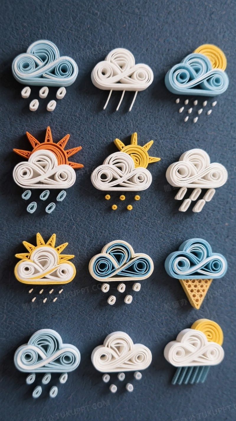 本作品内容为衍纸艺术十几个天气预报的图标, 格式为 jpg, 大小1 MB, 图片尺寸为936 x 1664, 源文件无水印, 欢迎使用熊猫办公。 如认为平台内容涉嫌侵权,可通过邮件:tousu@tukuppt.com提出书面通知,我们将及时处理。