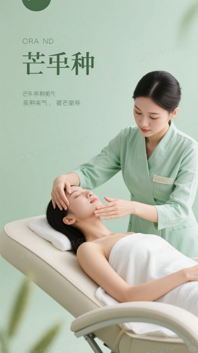 本作品内容为芒种海报一个身穿着浅绿色的美容师在专注为一个趟在美容椅的美女, 格式为 jpg, 大小1 MB, 图片尺寸为936 x 1664, 源文件无水印, 欢迎使用熊猫办公。 如认为平台内容涉嫌侵权,可通过邮件:tousu@tukuppt.com提出书面通知,我们将及时处理。