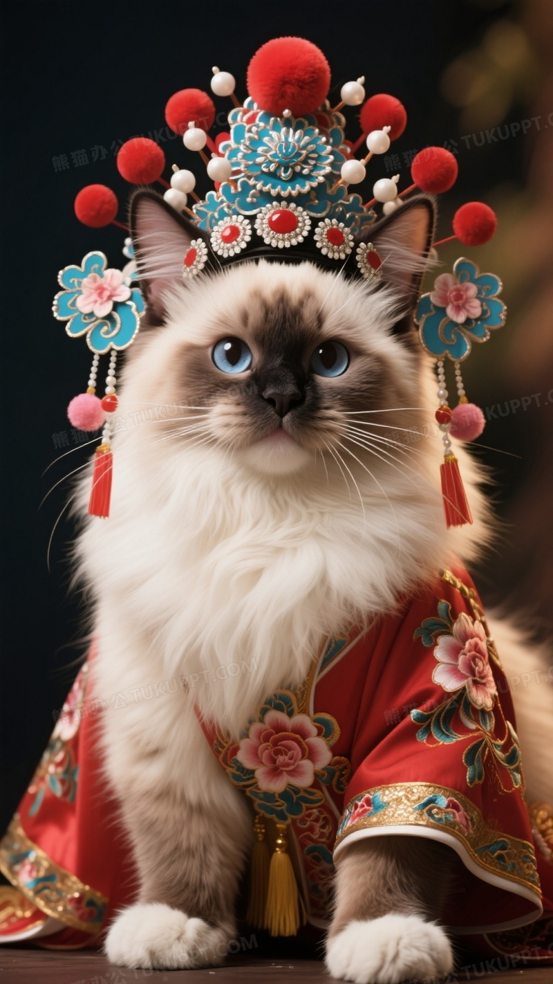 本作品内容为一只布偶猫京剧花旦打扮, 格式为 jpg, 大小1 MB, 图片尺寸为936 x 1664, 源文件无水印, 欢迎使用熊猫办公。 如认为平台内容涉嫌侵权,可通过邮件:tousu@tukuppt.com提出书面通知,我们将及时处理。