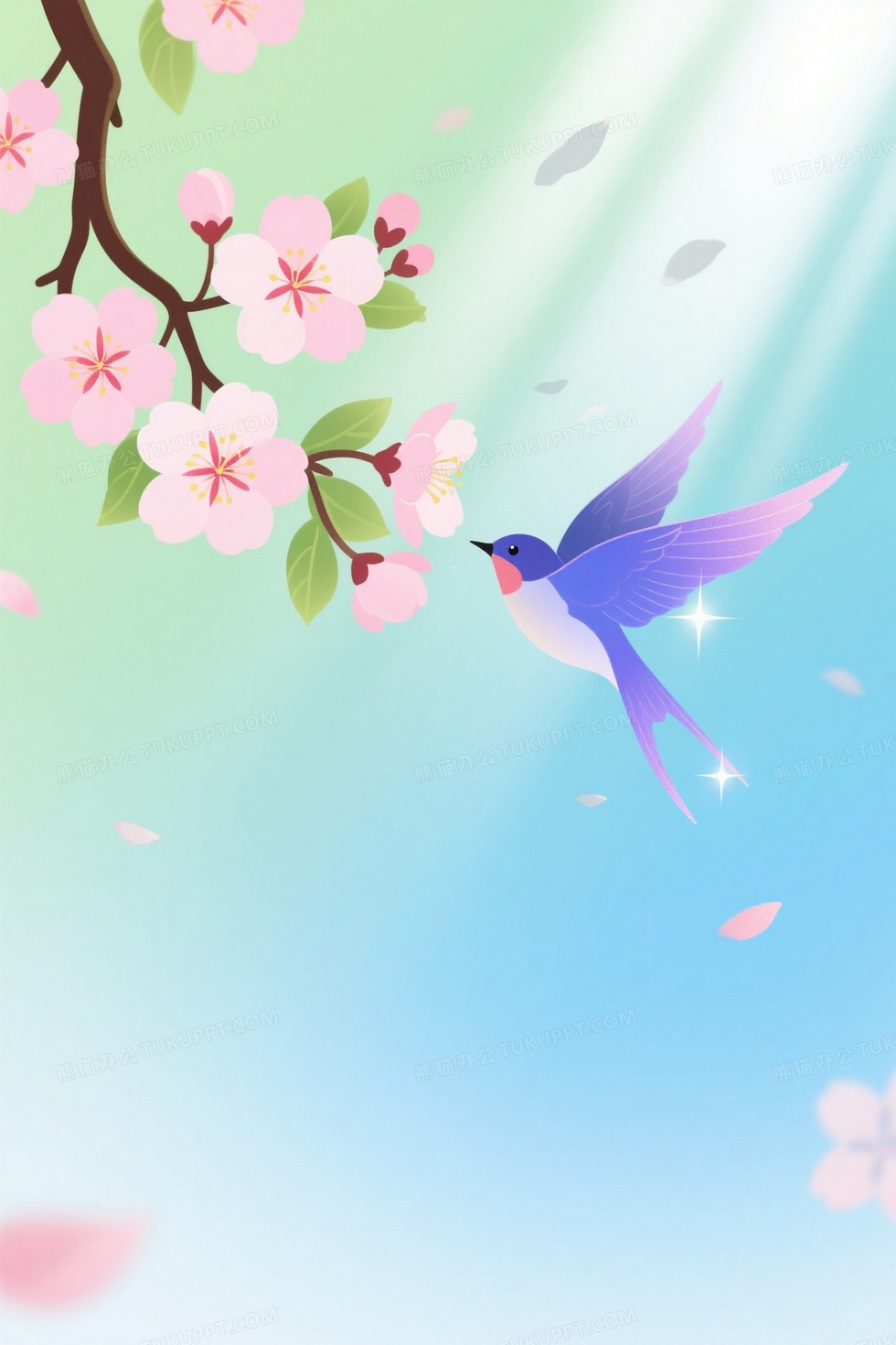 本作品内容为青绿渐变樱花飞鸟背景, 格式为 jpg, 大小1 MB, 图片尺寸为1280 x 1920, 作品中背景图片无需修改, 源文件无水印,可以直接使用, 欢迎使用熊猫办公。 如认为平台内容涉嫌侵权,可通过邮件:tousu@tukuppt.com提出书面通知,我们将及时处理。