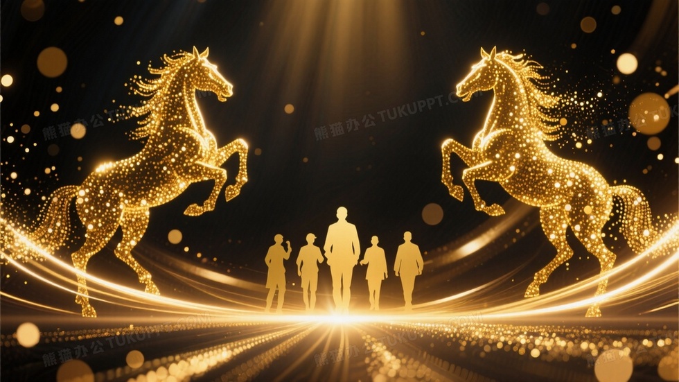 本作品内容为两侧是金色粒子骏马形象, 格式为 jpg, 大小1 MB, 图片尺寸为1664 x 936, 作品中背景图片无需修改, 源文件无水印,可以直接使用, 欢迎使用熊猫办公。 如认为平台内容涉嫌侵权,可通过邮件:tousu@tukuppt.com提出书面通知,我们将及时处理。