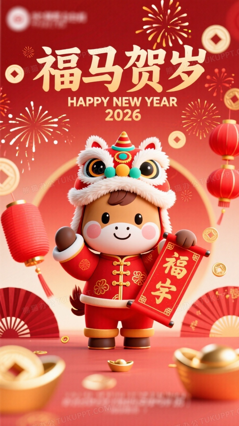 本作品内容为生成一张马年主题海报, 格式为 jpg, 大小1 MB, 图片尺寸为936 x 1664, 作品中背景图片无需修改, 源文件无水印,可以直接使用, 欢迎使用熊猫办公。 如认为平台内容涉嫌侵权,可通过邮件:tousu@tukuppt.com提出书面通知,我们将及时处理。