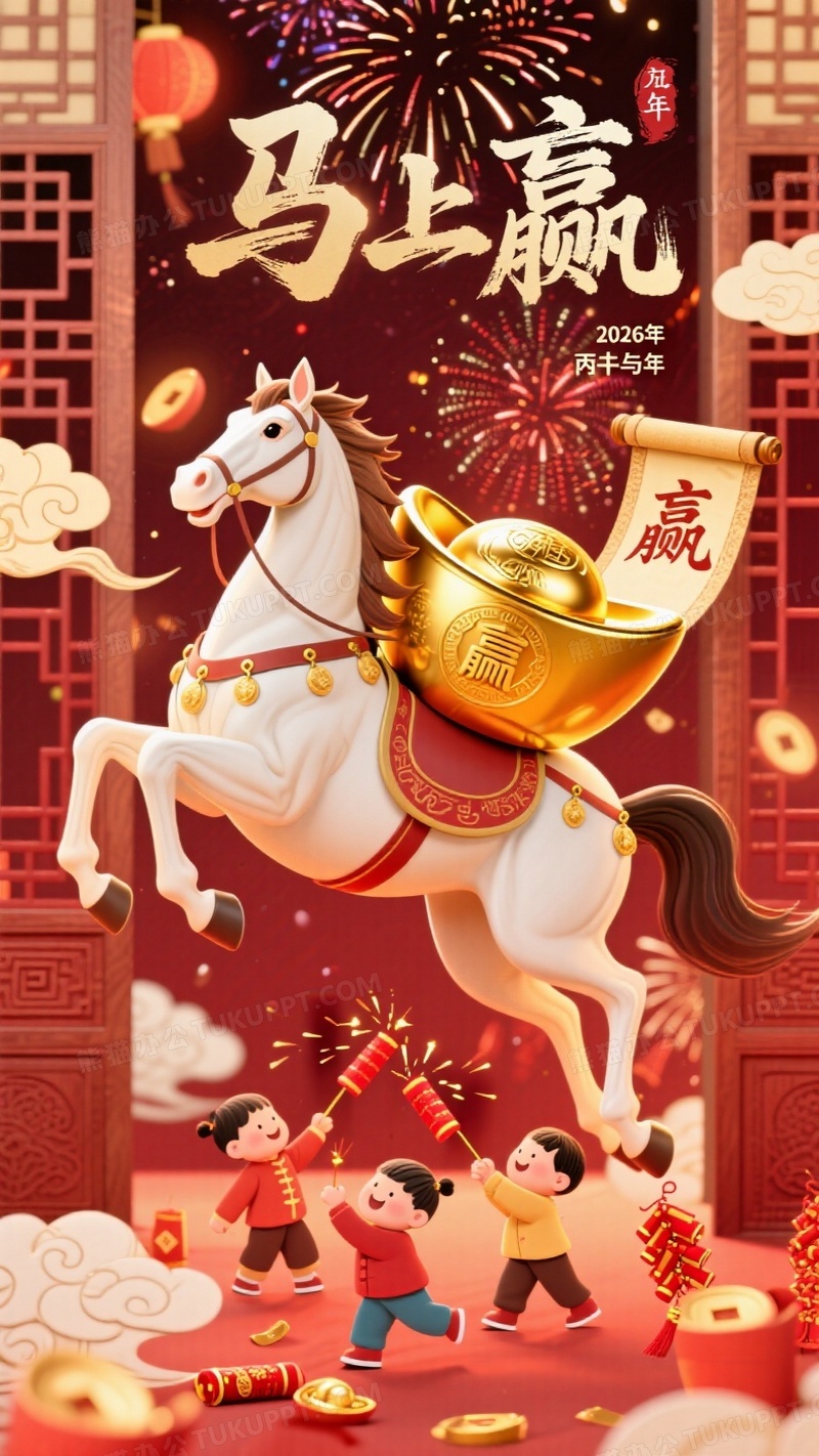 本作品内容为马年新年海报主题马上赢, 格式为 jpg, 大小1 MB, 图片尺寸为936 x 1664, 作品中背景图片无需修改, 源文件无水印,可以直接使用, 欢迎使用熊猫办公。 如认为平台内容涉嫌侵权,可通过邮件:tousu@tukuppt.com提出书面通知,我们将及时处理。