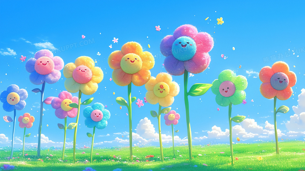本作品内容为3D草地上微笑毛毡花朵天空云层插画, 格式为 jpg, 大小3 MB, 图片尺寸为2912 x 1632, 源文件无水印, 欢迎使用熊猫办公。 如认为平台内容涉嫌侵权,可通过邮件:tousu@tukuppt.com提出书面通知,我们将及时处理。
