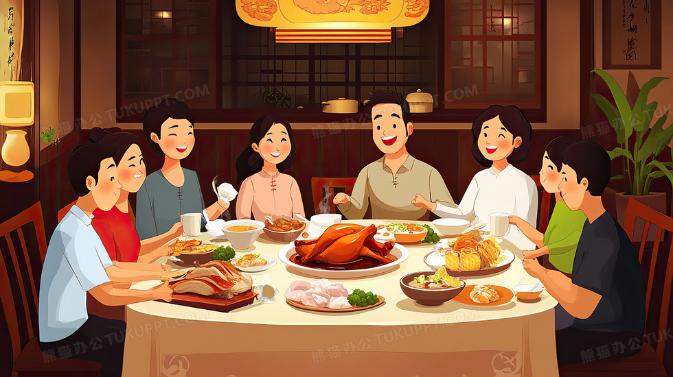 本作品内容为中式饭店聚餐插画, 格式为 jpg, 大小3 MB, 图片尺寸为2912 x 1632, 源文件无水印, 欢迎使用熊猫办公。 如认为平台内容涉嫌侵权,可通过邮件:tousu@tukuppt.com提出书面通知,我们将及时处理。