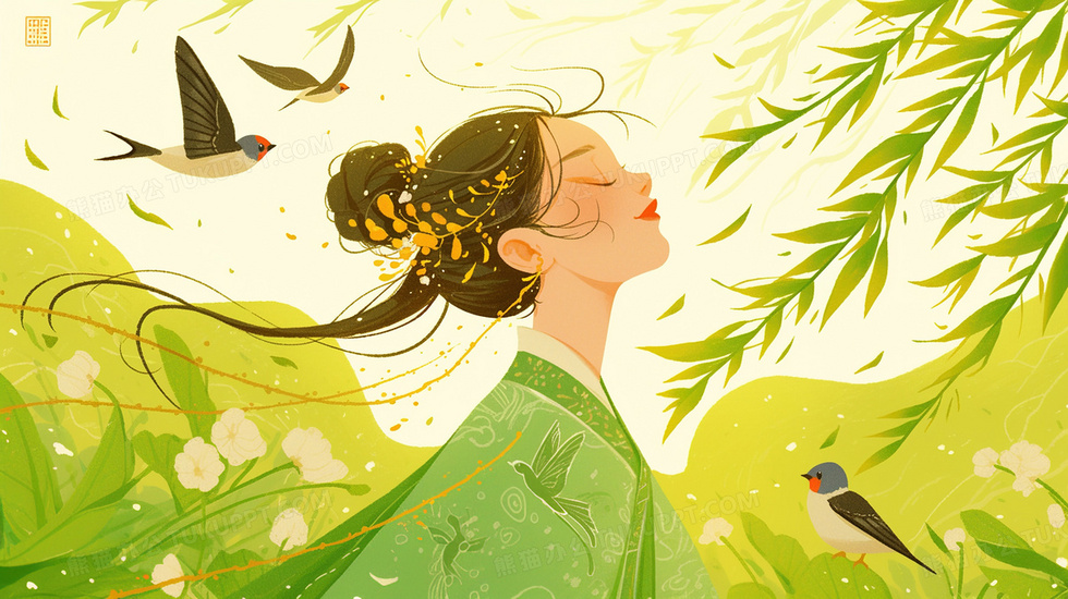 本作品内容为春季绿色柳枝飞鸟古风少女插画, 格式为 jpg, 大小3 MB, 图片尺寸为2912 x 1632, 源文件无水印, 欢迎使用熊猫办公。 如认为平台内容涉嫌侵权,可通过邮件:tousu@tukuppt.com提出书面通知,我们将及时处理。