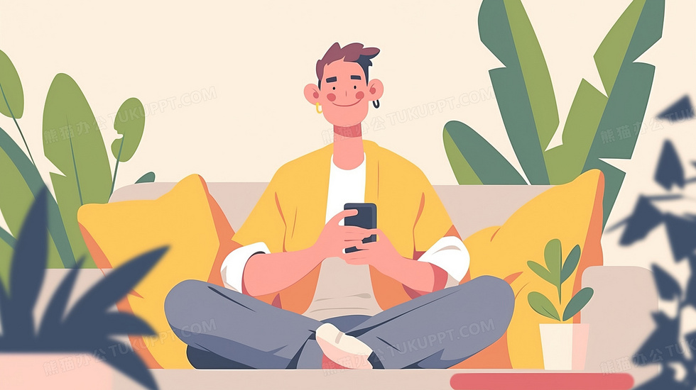 本作品内容为室内绿植围绕坐在沙发玩手机卡通男孩插画, 格式为 jpg, 大小2 MB, 图片尺寸为2912 x 1632, 源文件无水印, 欢迎使用熊猫办公。 如认为平台内容涉嫌侵权,可通过邮件:tousu@tukuppt.com提出书面通知,我们将及时处理。