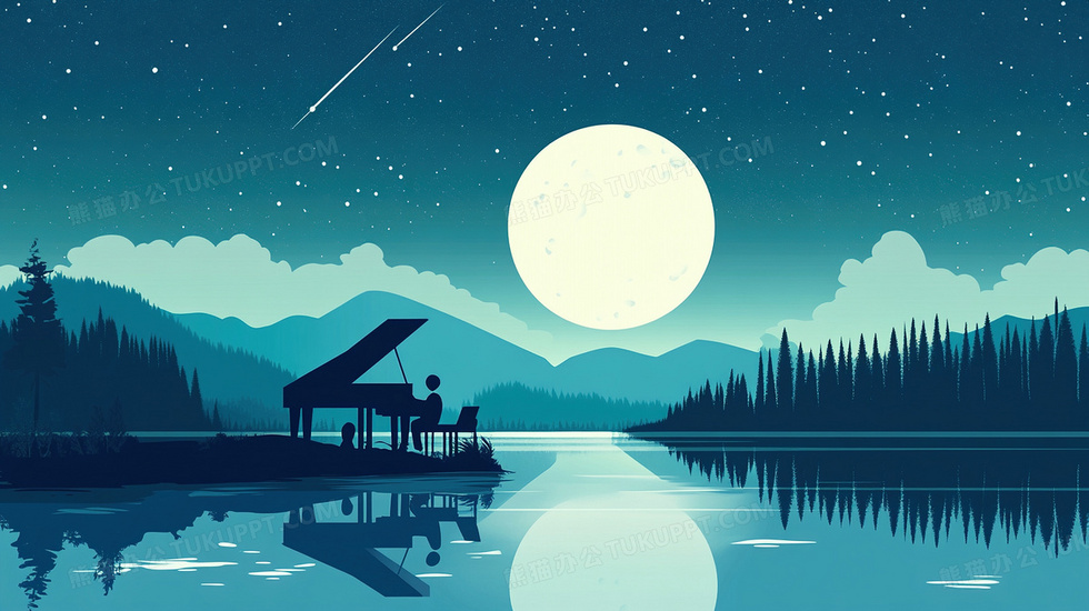 本作品内容为湖泊森林钢琴影子剪影风景插画, 格式为 jpg, 大小3 MB, 图片尺寸为2912 x 1632, 源文件无水印, 欢迎使用熊猫办公。 如认为平台内容涉嫌侵权,可通过邮件:tousu@tukuppt.com提出书面通知,我们将及时处理。