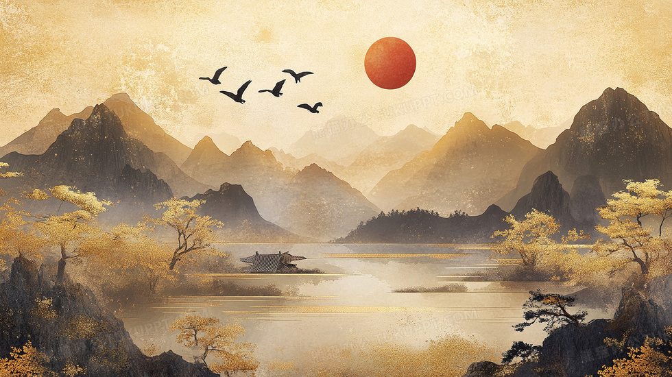 本作品内容为水墨鎏金烫金中国风山水插画, 格式为 jpg, 大小4 MB, 图片尺寸为2912 x 1632, 源文件无水印, 欢迎使用熊猫办公。 如认为平台内容涉嫌侵权,可通过邮件:tousu@tukuppt.com提出书面通知,我们将及时处理。