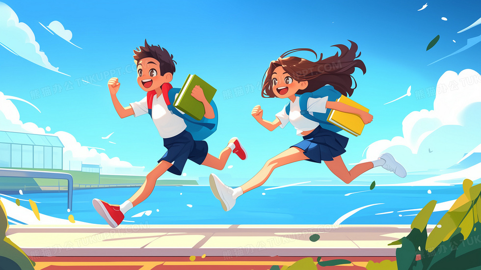 本作品内容为两名高中生抱着书本在海边奔跑插画, 格式为 jpg, 大小3 MB, 图片尺寸为2912 x 1632, 源文件无水印, 欢迎使用熊猫办公。 如认为平台内容涉嫌侵权,可通过邮件:tousu@tukuppt.com提出书面通知,我们将及时处理。