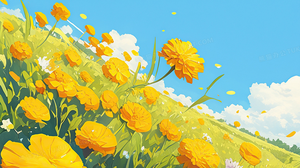 本作品内容为盛开的金盏花丛唯美风景插画, 格式为 jpg, 大小4 MB, 图片尺寸为2912 x 1632, 源文件无水印, 欢迎使用熊猫办公。 如认为平台内容涉嫌侵权,可通过邮件:tousu@tukuppt.com提出书面通知,我们将及时处理。