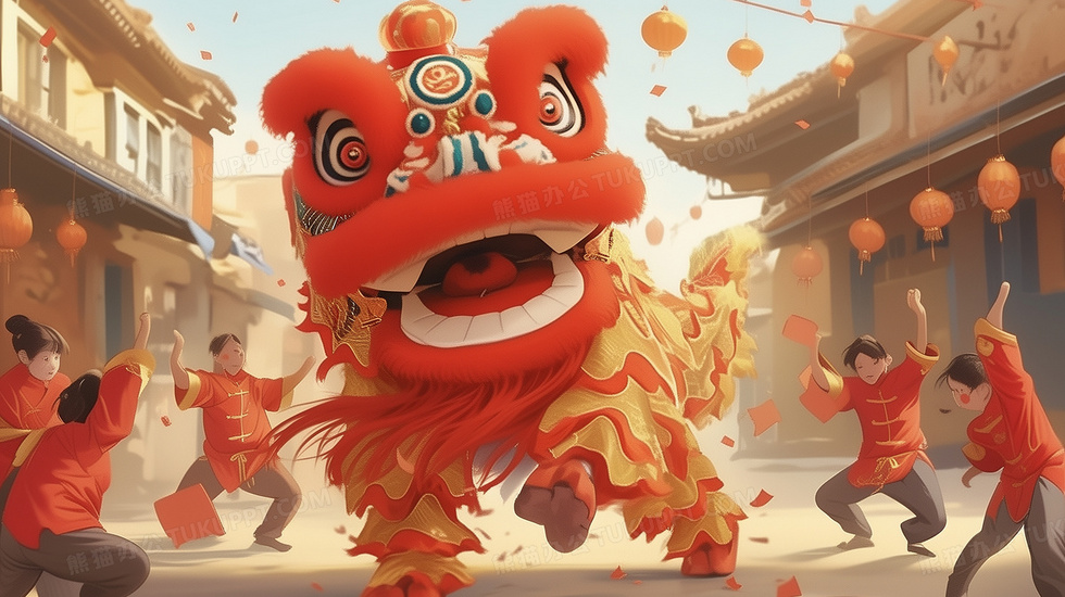 本作品内容为红色舞狮在挂满橘色灯笼的古城街道上欢快地舞动插画, 格式为 jpg, 大小6 MB, 图片尺寸为2912 x 1632, 源文件无水印, 欢迎使用熊猫办公。 如认为平台内容涉嫌侵权,可通过邮件:tousu@tukuppt.com提出书面通知,我们将及时处理。