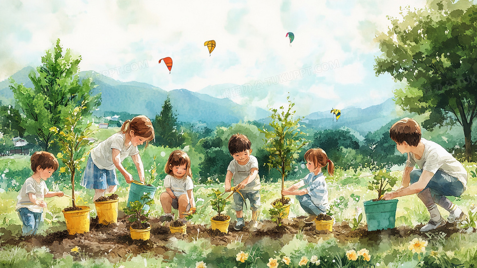 本作品内容为卡通插画风格小朋友种植树苗的插画, 格式为 jpg, 大小4 MB, 图片尺寸为2912 x 1632, 源文件无水印, 欢迎使用熊猫办公。 如认为平台内容涉嫌侵权,可通过邮件:tousu@tukuppt.com提出书面通知,我们将及时处理。