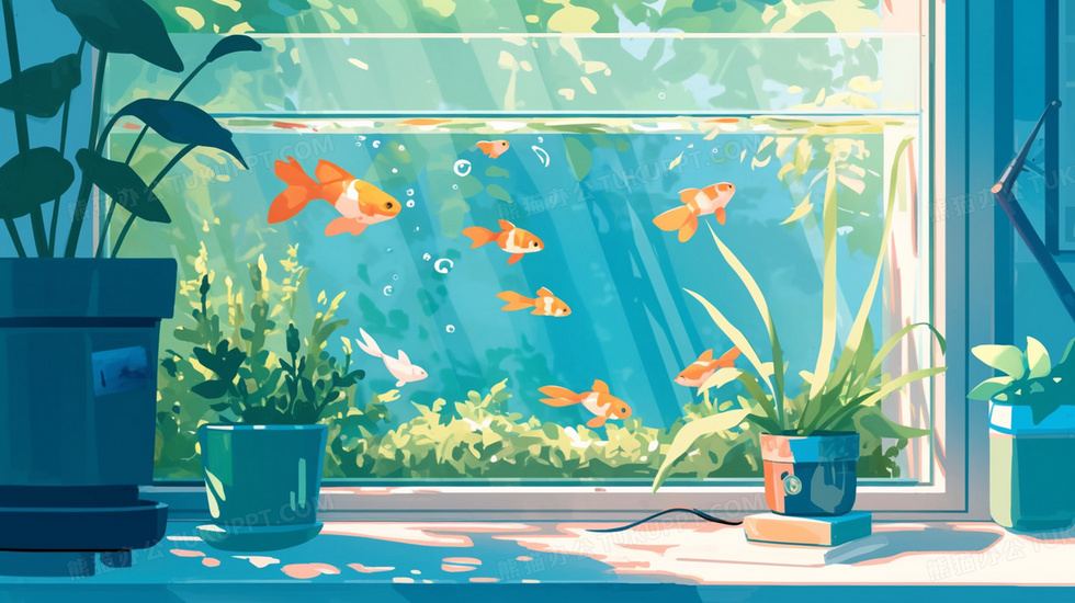 本作品内容为金鱼在带绿植的鱼缸里游动插画, 格式为 jpg, 大小2 MB, 图片尺寸为1456 x 816, 源文件无水印, 欢迎使用熊猫办公。 如认为平台内容涉嫌侵权,可通过邮件:tousu@tukuppt.com提出书面通知,我们将及时处理。