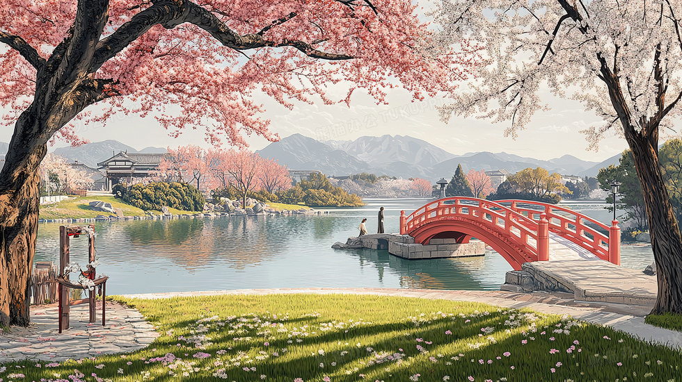 本作品内容为春季户外公园湖面上一座小桥插画, 格式为 jpg, 大小6 MB, 图片尺寸为2912 x 1632, 源文件无水印, 欢迎使用熊猫办公。 如认为平台内容涉嫌侵权,可通过邮件:tousu@tukuppt.com提出书面通知,我们将及时处理。