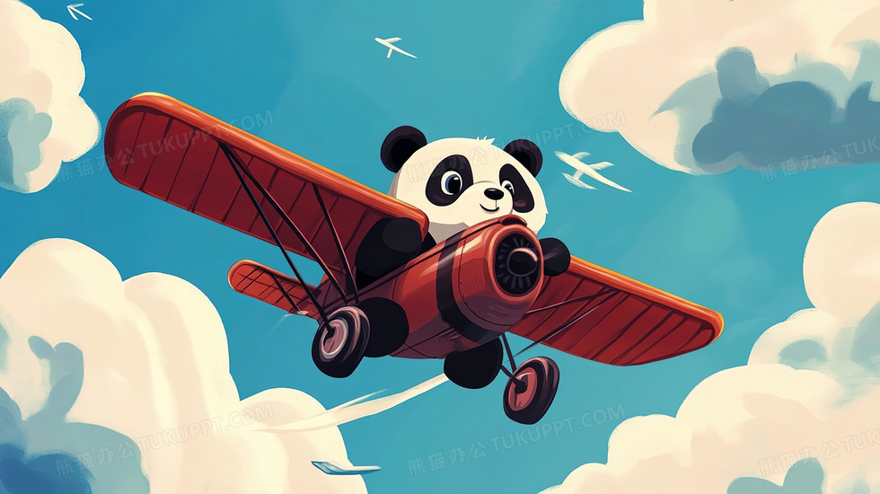 本作品内容为蓝天白云中开飞机的可爱卡通熊猫飞行员插画, 格式为 jpg, 大小2 MB, 图片尺寸为2912 x 1632, 源文件无水印, 欢迎使用熊猫办公。 如认为平台内容涉嫌侵权,可通过邮件:tousu@tukuppt.com提出书面通知,我们将及时处理。