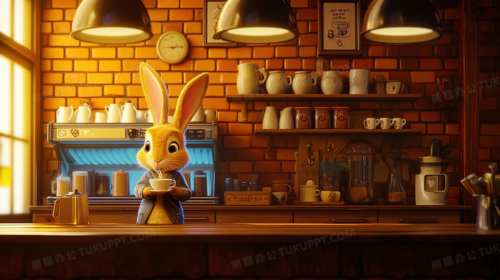 本作品内容为咖啡店内做咖啡的兔子职员插画, 格式为 jpg, 大小3 MB, 图片尺寸为2912 x 1632, 源文件无水印, 欢迎使用熊猫办公。 如认为平台内容涉嫌侵权,可通过邮件:tousu@tukuppt.com提出书面通知,我们将及时处理。
