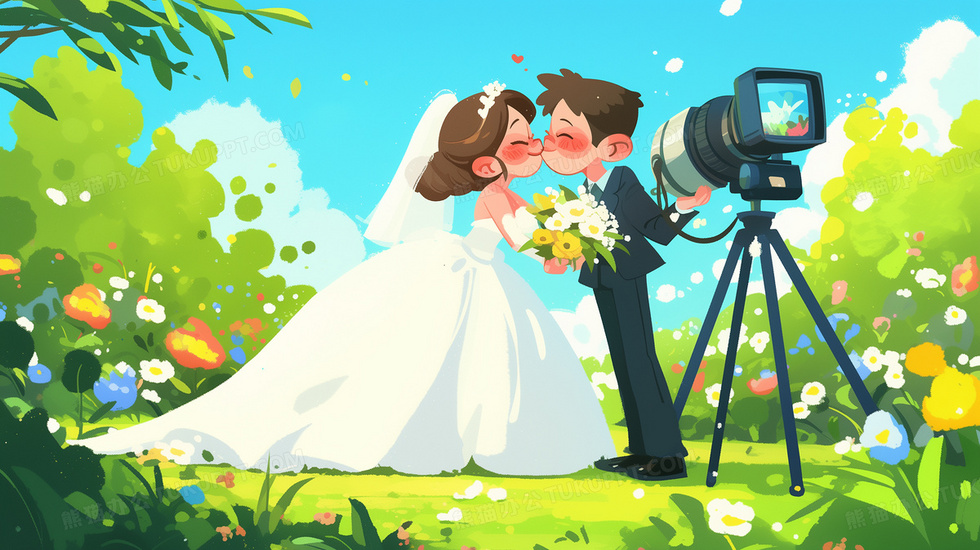 本作品内容为一位新婚夫妻拍婚纱照插画, 格式为 jpg, 大小5 MB, 图片尺寸为2912 x 1632, 源文件无水印, 欢迎使用熊猫办公。 如认为平台内容涉嫌侵权,可通过邮件:tousu@tukuppt.com提出书面通知,我们将及时处理。