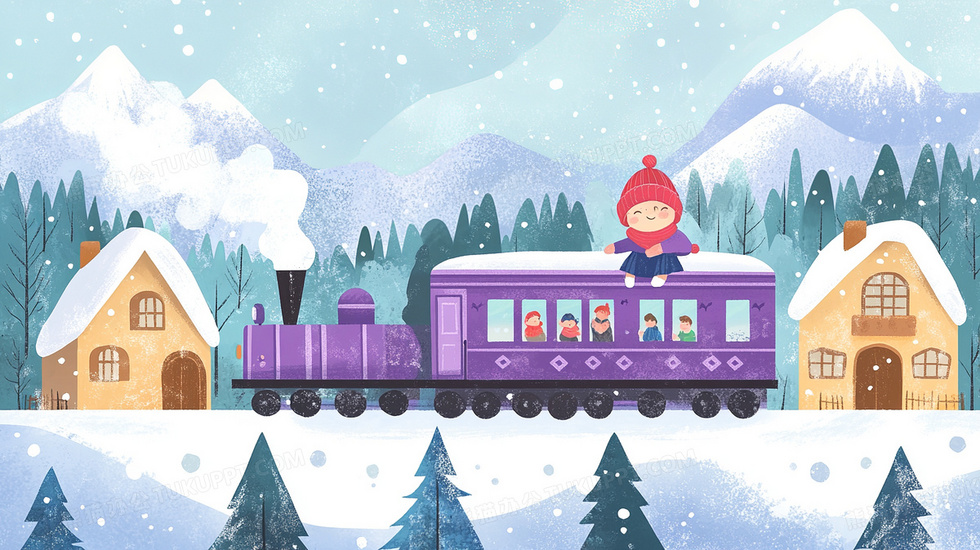 本作品内容为冬季小女孩坐小火车顶途径村庄的卡通插画, 格式为 jpg, 大小3 MB, 图片尺寸为2912 x 1632, 源文件无水印, 欢迎使用熊猫办公。 如认为平台内容涉嫌侵权,可通过邮件:tousu@tukuppt.com提出书面通知,我们将及时处理。