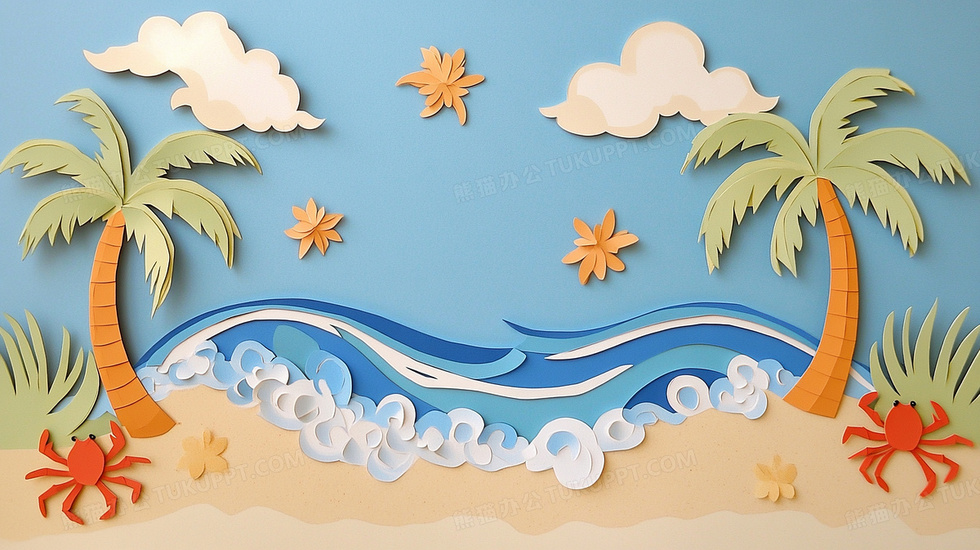 本作品内容为沙滩剪纸风风景风光插画, 格式为 jpg, 大小3 MB, 图片尺寸为2912 x 1632, 源文件无水印, 欢迎使用熊猫办公。 如认为平台内容涉嫌侵权,可通过邮件:tousu@tukuppt.com提出书面通知,我们将及时处理。