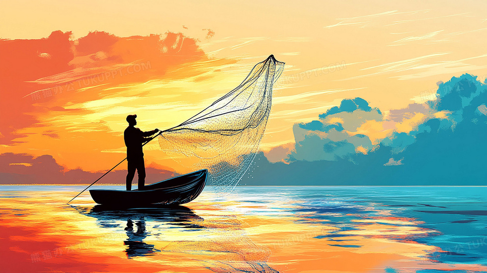 本作品内容为卡通渔民撒网捕鱼背景, 格式为 jpg, 大小1 MB, 图片尺寸为2912 x 1632, 作品中背景图片无需修改, 源文件无水印,可以直接使用, 欢迎使用熊猫办公。 如认为平台内容涉嫌侵权,可通过邮件:tousu@tukuppt.com提出书面通知,我们将及时处理。