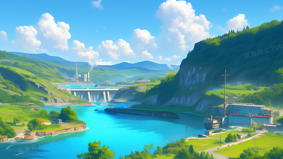 本作品内容为晴朗山谷中的水力发电站插画, 格式为 jpg, 大小6 MB, 图片尺寸为2912 x 1632, 源文件无水印, 欢迎使用熊猫办公。 如认为平台内容涉嫌侵权,可通过邮件:tousu@tukuppt.com提出书面通知,我们将及时处理。