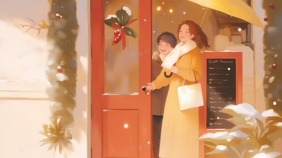 本作品内容为一对情侣从咖啡馆出来欣赏雪景插画, 格式为 jpg, 大小6 MB, 图片尺寸为2912 x 1632, 源文件无水印, 欢迎使用熊猫办公。 如认为平台内容涉嫌侵权,可通过邮件:tousu@tukuppt.com提出书面通知,我们将及时处理。