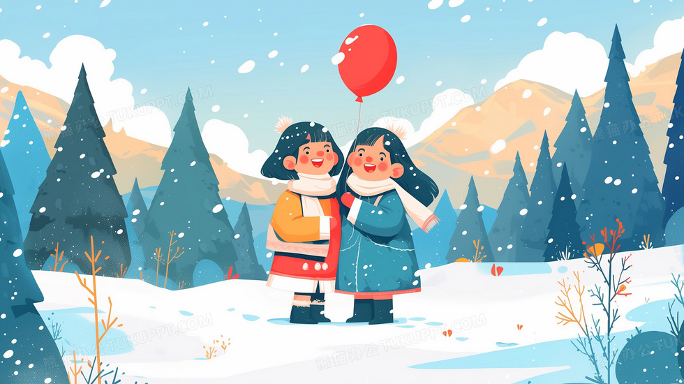 本作品内容为一对小姐妹手持气球站在雪地里开心的笑插画, 格式为 jpg, 大小4 MB, 图片尺寸为2912 x 1632, 源文件无水印, 欢迎使用熊猫办公。 如认为平台内容涉嫌侵权,可通过邮件:tousu@tukuppt.com提出书面通知,我们将及时处理。
