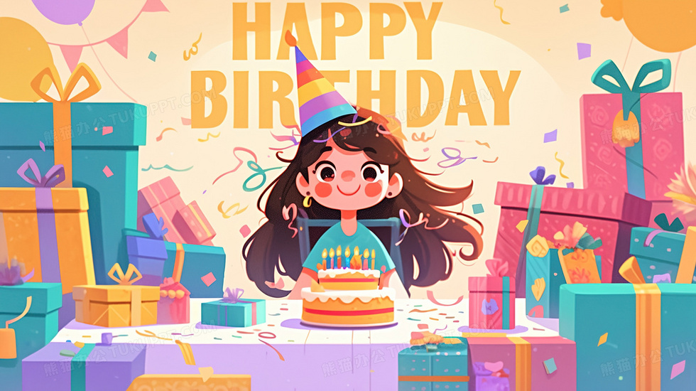 本作品内容为戴生日帽庆祝过生日小女孩插画, 格式为 jpg, 大小2 MB, 图片尺寸为2912 x 1632, 源文件无水印, 欢迎使用熊猫办公。 如认为平台内容涉嫌侵权,可通过邮件:tousu@tukuppt.com提出书面通知,我们将及时处理。