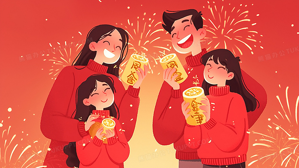 本作品内容为喜庆新年手拿糖罐的开心一家四口插画, 格式为 jpg, 大小2 MB, 图片尺寸为2912 x 1632, 源文件无水印, 欢迎使用熊猫办公。 如认为平台内容涉嫌侵权,可通过邮件:tousu@tukuppt.com提出书面通知,我们将及时处理。