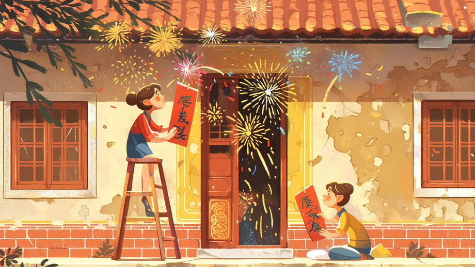 本作品内容为春节门口贴对联的两个女孩插画, 格式为 jpg, 大小4 MB, 图片尺寸为2912 x 1632, 源文件无水印, 欢迎使用熊猫办公。 如认为平台内容涉嫌侵权,可通过邮件:tousu@tukuppt.com提出书面通知,我们将及时处理。
