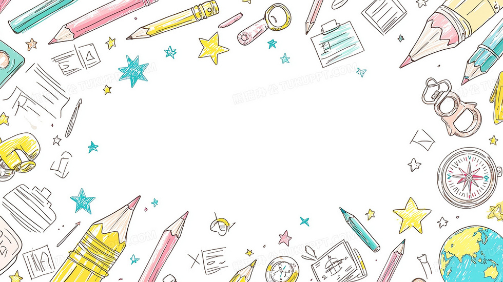本作品内容为卡通文具装饰边框创意背景, 格式为 jpg, 大小2 MB, 图片尺寸为2912 x 1632, 作品中背景图片无需修改, 源文件无水印,可以直接使用, 欢迎使用熊猫办公。 如认为平台内容涉嫌侵权,可通过邮件:tousu@tukuppt.com提出书面通知,我们将及时处理。