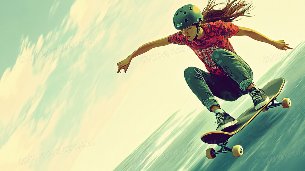 本作品内容为卡通风玩滑板的女孩背景, 格式为 jpg, 大小3 MB, 图片尺寸为2912 x 1632, 作品中背景图片无需修改, 源文件无水印,可以直接使用, 欢迎使用熊猫办公。 如认为平台内容涉嫌侵权,可通过邮件:tousu@tukuppt.com提出书面通知,我们将及时处理。