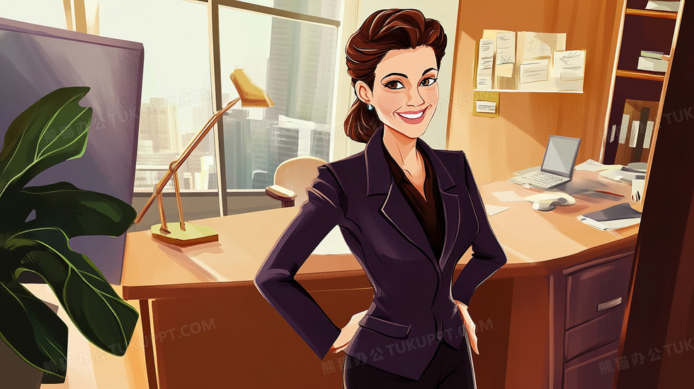 本作品内容为女性职业职场中成功的女老板在办公室插画, 格式为 jpg, 大小3 MB, 图片尺寸为2912 x 1632, 源文件无水印, 欢迎使用熊猫办公。 如认为平台内容涉嫌侵权,可通过邮件:tousu@tukuppt.com提出书面通知,我们将及时处理。