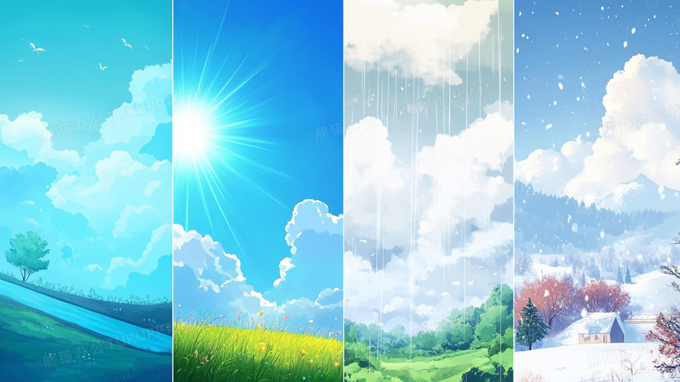 本作品内容为天气气象阴晴雨雪四格插画, 格式为 jpg, 大小1 MB, 图片尺寸为1456 x 816, 源文件无水印, 欢迎使用熊猫办公。 如认为平台内容涉嫌侵权,可通过邮件:tousu@tukuppt.com提出书面通知,我们将及时处理。
