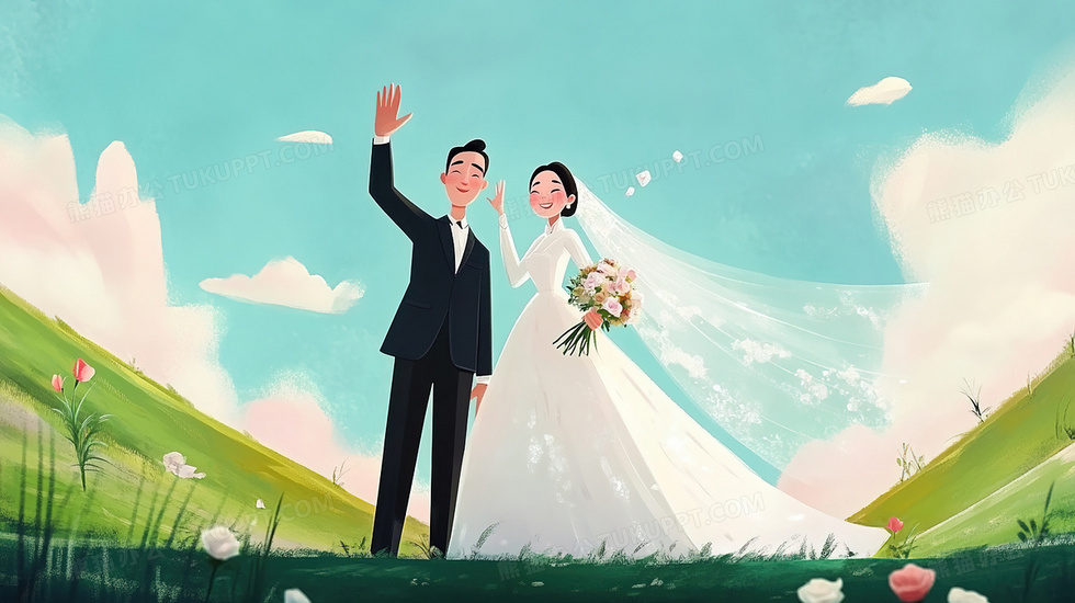 本作品内容为卡通手绘帅哥美女新人结婚插画, 格式为 jpg, 大小3 MB, 图片尺寸为2912 x 1632, 源文件无水印, 欢迎使用熊猫办公。 如认为平台内容涉嫌侵权,可通过邮件:tousu@tukuppt.com提出书面通知,我们将及时处理。