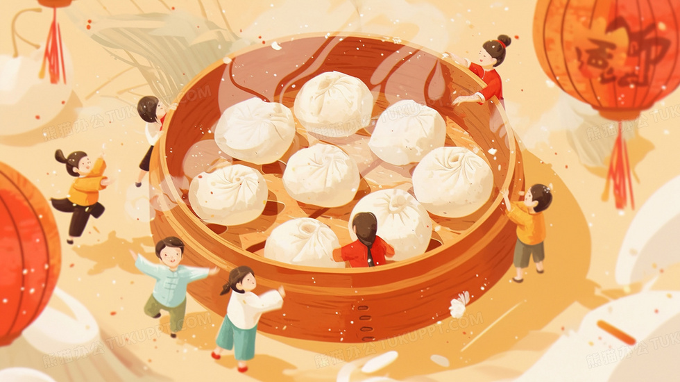本作品内容为卡通创意微缩人物蒸笼美食包子插画, 格式为 jpg, 大小2 MB, 图片尺寸为2912 x 1632, 源文件无水印, 欢迎使用熊猫办公。 如认为平台内容涉嫌侵权,可通过邮件:tousu@tukuppt.com提出书面通知,我们将及时处理。