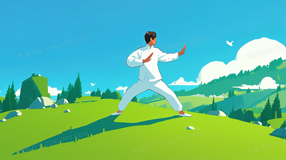 本作品内容为草地晨练太极拳白衣男子插画, 格式为 jpg, 大小2 MB, 图片尺寸为2912 x 1632, 源文件无水印, 欢迎使用熊猫办公。 如认为平台内容涉嫌侵权,可通过邮件:tousu@tukuppt.com提出书面通知,我们将及时处理。