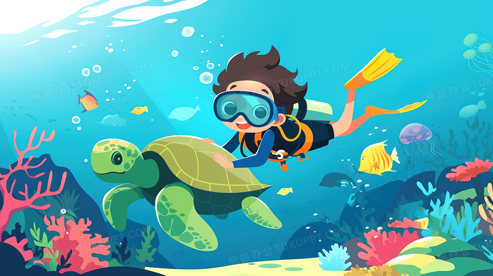 本作品内容为卡通男孩海洋潜水时和海龟嬉戏插画, 格式为 jpg, 大小3 MB, 图片尺寸为2912 x 1632, 源文件无水印, 欢迎使用熊猫办公。 如认为平台内容涉嫌侵权,可通过邮件:tousu@tukuppt.com提出书面通知,我们将及时处理。
