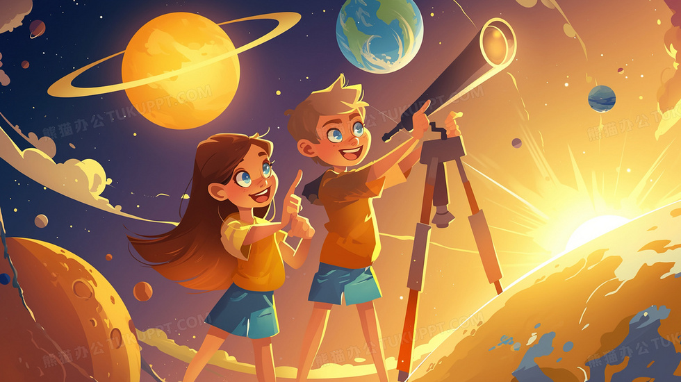 本作品内容为孩子们拿天文望远镜探索太空创意插画, 格式为 jpg, 大小2 MB, 图片尺寸为2912 x 1632, 源文件无水印, 欢迎使用熊猫办公。 如认为平台内容涉嫌侵权,可通过邮件:tousu@tukuppt.com提出书面通知,我们将及时处理。